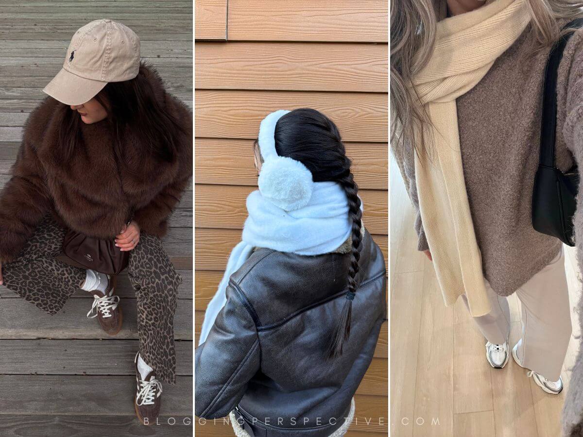 This outfit feels like a winter dream – that long faux fur coat is everything! The white and beige color palette is so elegant and adding earmuffs instead of a regular beanie is such a cute touch. I feel like this is what you wear when you’re taking aesthetic winter photos or going to a fancy holiday market. It’s definitely a statement look but in the softest, most approachable way possible.