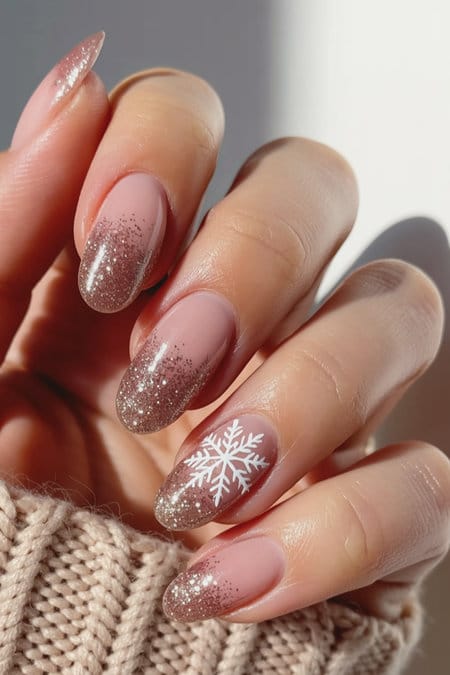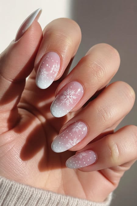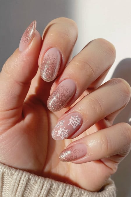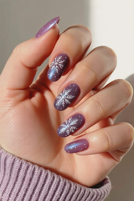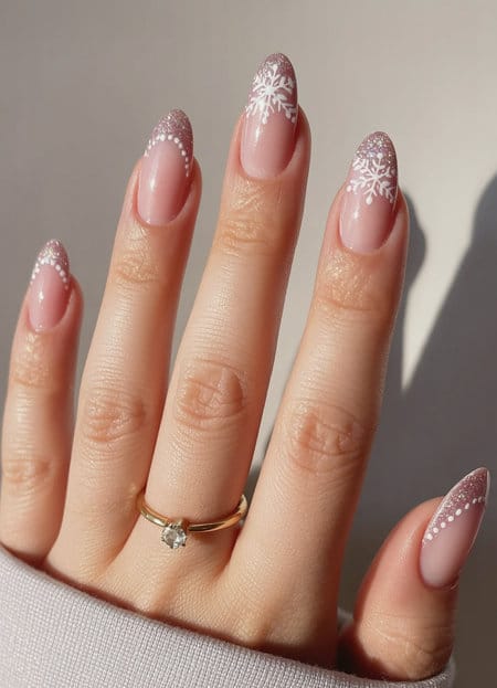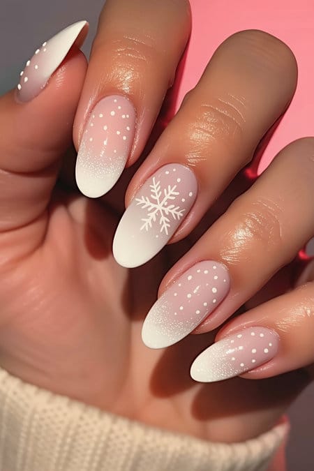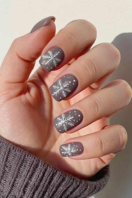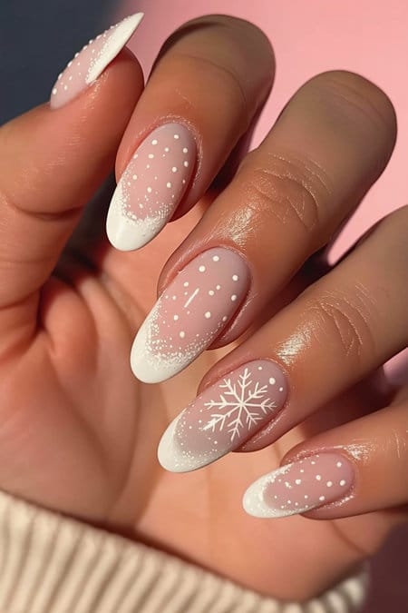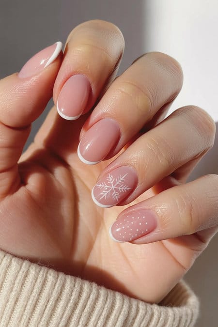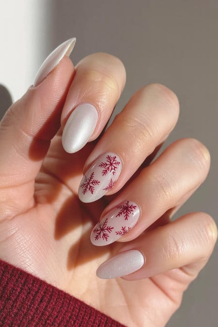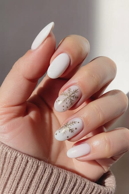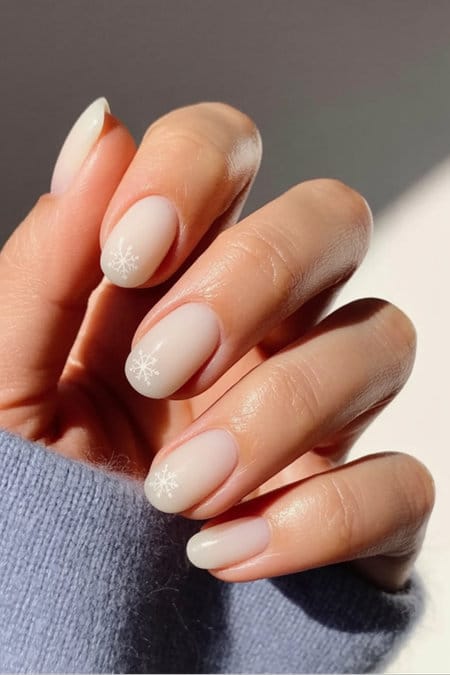 Want a classy nail design that has just a hint of adorable? This one’s for you then – a milky base with tiny snowflakes scattered all over. It feels fancy. Keep flakes on the smaller side, dainty and refined.