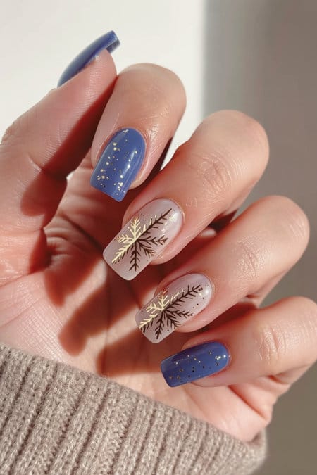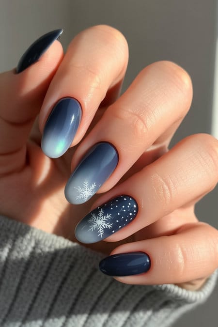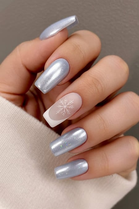 Loving this one for its elegant look and versatility – baby blue chrome has that icy mirror effect over a pale blue gel base. Keep most nails simple: draw one crisp white snowflake per hand with a fine liner brush, flash-cure, then top coat.