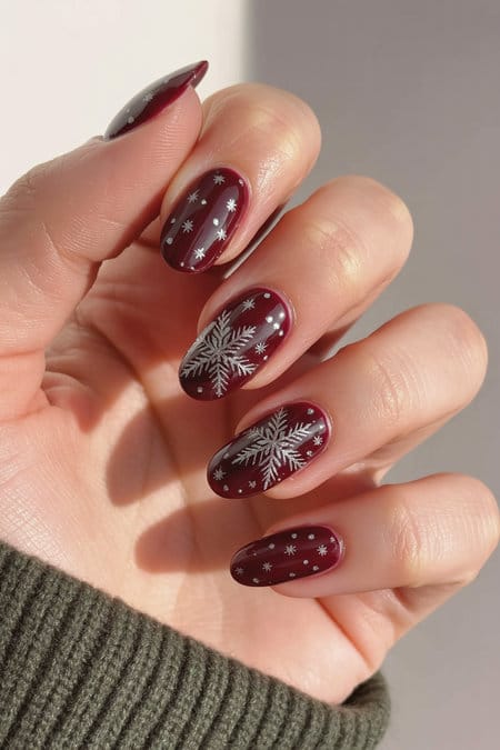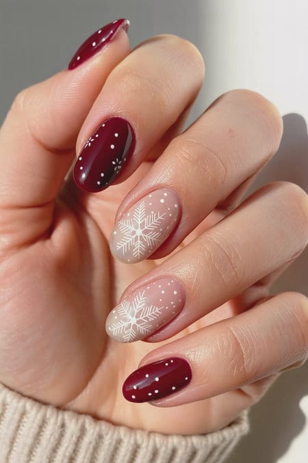For a coordinated and kind of Christmas-y set, alternate burgundy and white/sheer milky nails. Add some dainty snowflakes on white nails and tiny gold dots on burgundy, then top with top coat. That color mix is great for Holidays.