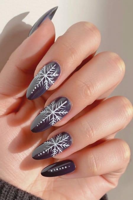 On this look, dark navy chrome base makes long almond nails suuuper dramatic. Then paint large white snowflakes on top and add some dotted lines with a dotting tools to make it even more extra. Moody, seasonal, cute.