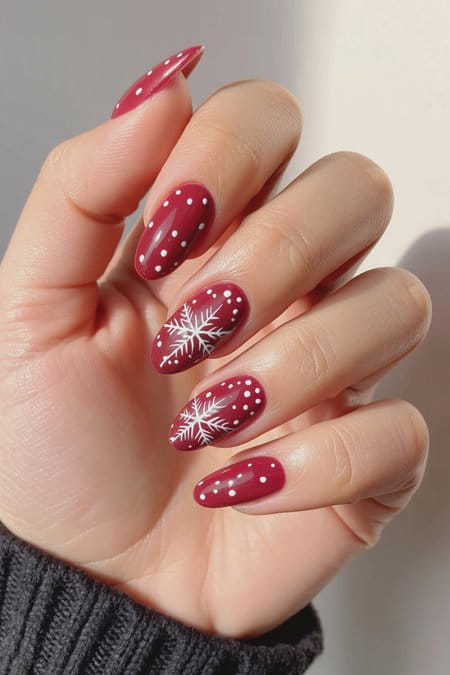Go for berry red shade for playful Christmas-ready look, with sprinkled white snow dots. On a feature nail or two, and one some detailed snowflakes. Very cute and festive.