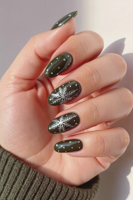 This shader of forest green has lots of depth and creates contrast against silvery snowflakes. It’s a great color combination for a festive nails look.