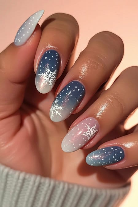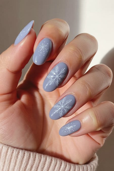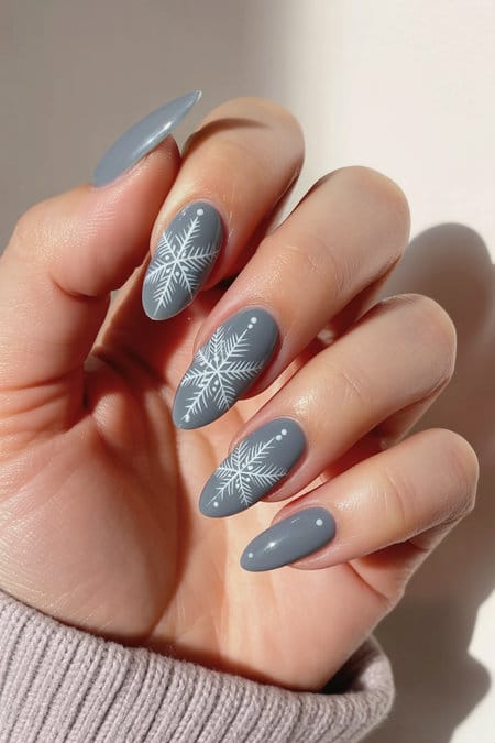 Artsy winter vibes. Long almond shape is always one of the most popular that makes any design look great. Steel blue color sets the mood for boho-style snowflakes with long lines, and little dots.