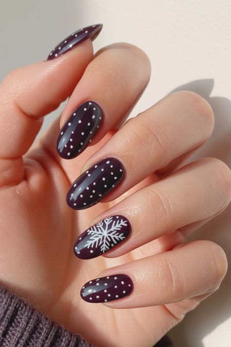 Snowy nails don’t have to always be white! A dark base creates a beautiful contrast and a slightly moody vibe, if that is your kind of thing. Like this dark plum shade – it makes white dots and a snowflake really pop. Love that snowstorm in the night effect.