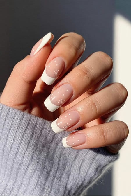 It’s a French mani, but a little bit updated for winter weather – change crisp white line into gradient effect, created by dotting tiny little snow dots around the white tip. Then place a large accent snowflake on one nail – totally adorable.