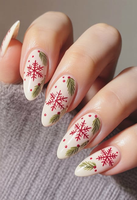 This one totally screams Christmas due to the color palette – warm and classic deep cherry or wine red for snowflakes and tiny forest green fir branches. Sprinkle some holly berries/red snow dots too. Those holiday vibes are delivering.