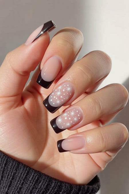 Perhaps something more edgy? Go for this blach French mani look – just start with a nude base, paint sleek black French tips, and soften the design with tiny white dots and flakes, like snowburst on your nails. Keep it to a few nails, or do all of them – totally up to you.