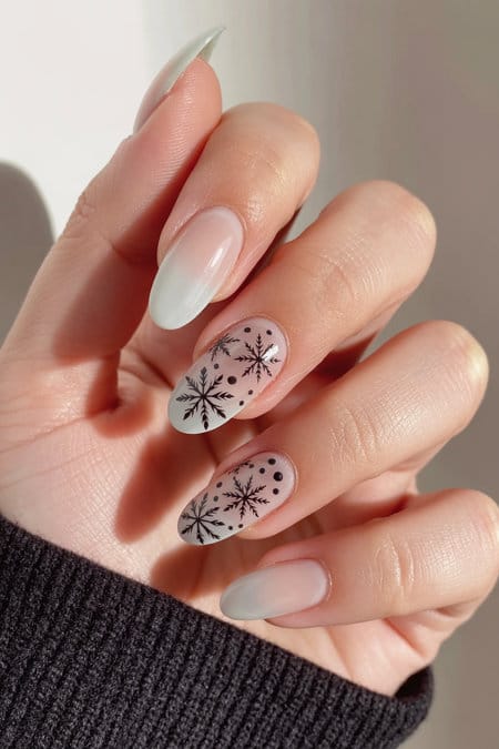 Blend sheer nude into white with a sponge for a soft ombre and add fine black snowflakes for a graphic twist. Keep the lines small with a micro liner brush and seal with a thin glossy top coat.