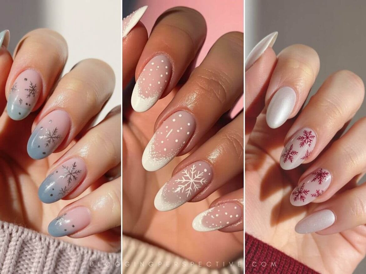Want a classy nail design that has just a hint of adorable? This one’s for you then – a milky base with tiny snowflakes scattered all over. It feels fancy. Keep flakes on the smaller side, dainty and refined.