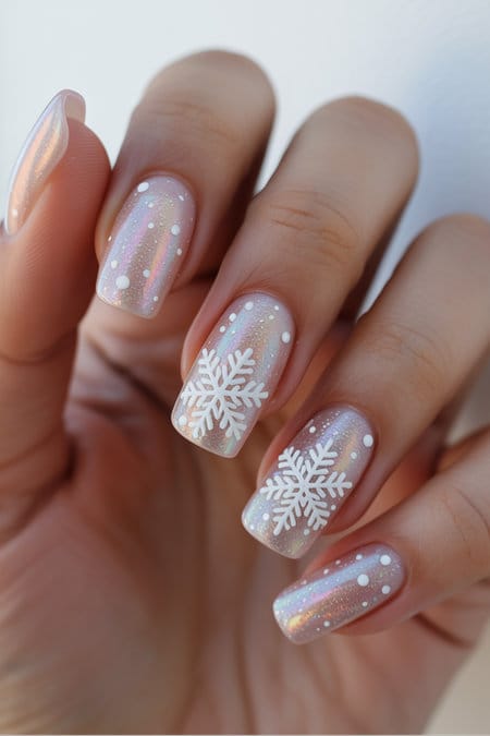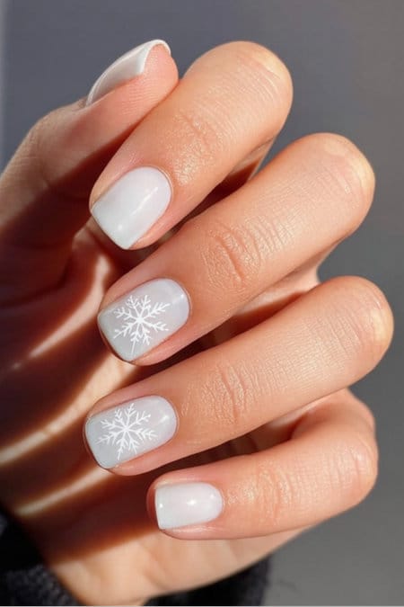 Go for a classic look with milky white nails with teeny tiny snowflakes – it is classic winter. Its clean and screams winter without trying hard! Plus white makes your hands look nice.