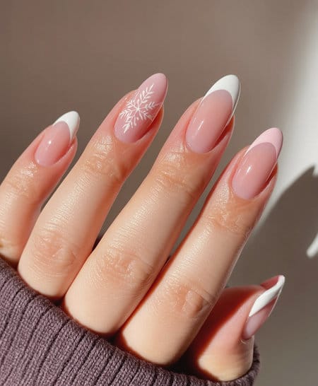Most nails get regular french tips then one nail gets a big snowflake design. You can also mix and match colors – some white French tips, some pastel pink. This way you get the classy french look but still show your nail art! I do this a lot, it’s simple and cute – always works.