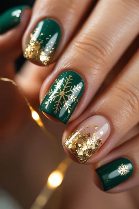 Green with gold glitter looks like Christmas trees! Add gold shiny snowflakes and gold glitter or foil pieces on some of the tips for festive vibes! The gold makes it feel fancy instead of basic.