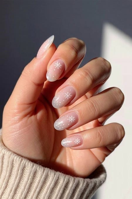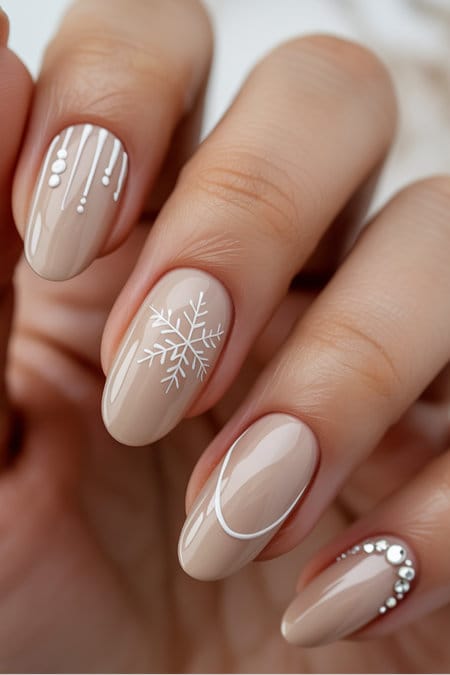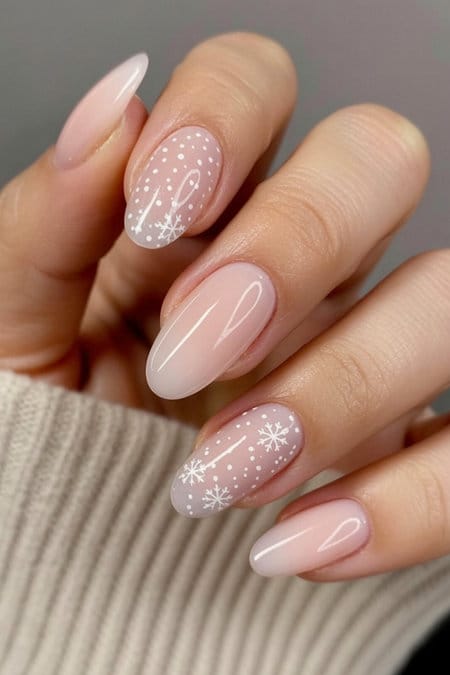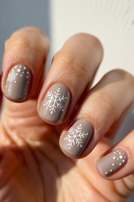 Short plus beige with tiny white snowflakes is super subtle for work and if you want something simple. White dots around like gentle snow and its barely there but still festive! Good if your job is strict about nails or you just like simplicity.