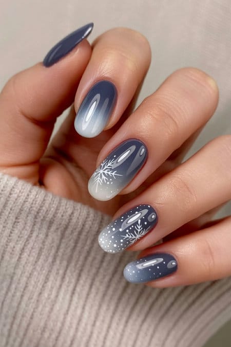 Navy fading into white is so smooth and pretty, then add white dots at the tips or an accent nail to make it even more frosty looking! Reminds me of really cold nights when everything sparkles.