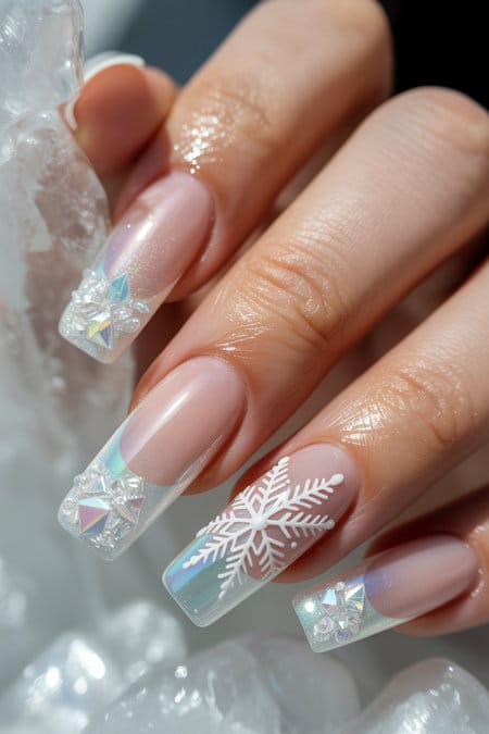 Long Square Frenchies With Crystal Tips And Large Snowflake