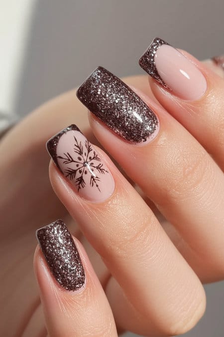 Brown for winter maybe sounds weird but its actually really pretty when it’s in glitter form. The single snowflake accent stands out nice against the neutral base! Nobody does this color in winter and yet they should.