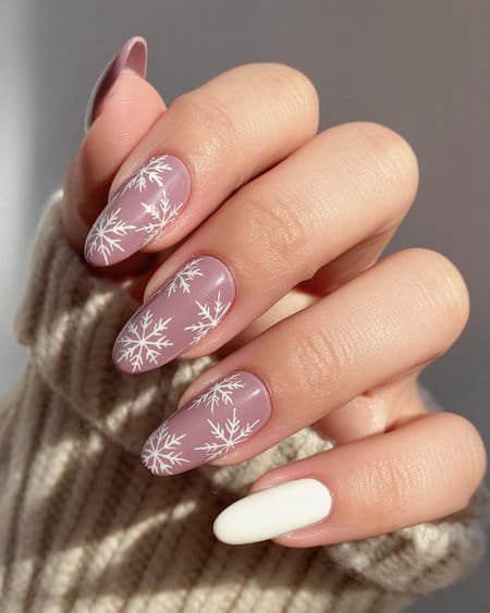 Mauve is that pinky/purplish/dusty/muted color thats really pretty and not to girly – perfect balanced look for anyone. Add white snowflakes and an accent white pinky nail and it just works for everything! This color is one of my favorite understated shades in winter time.