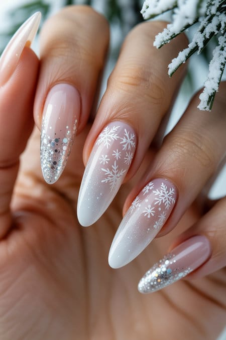 Long pointy nails that go from neutral pinkish base to white with some accent nails with silver glitter on the tips – what a winter wonderland! The flawless long shape with soft colors looks really cool together! The glitter makes it icy and a bit more glam.