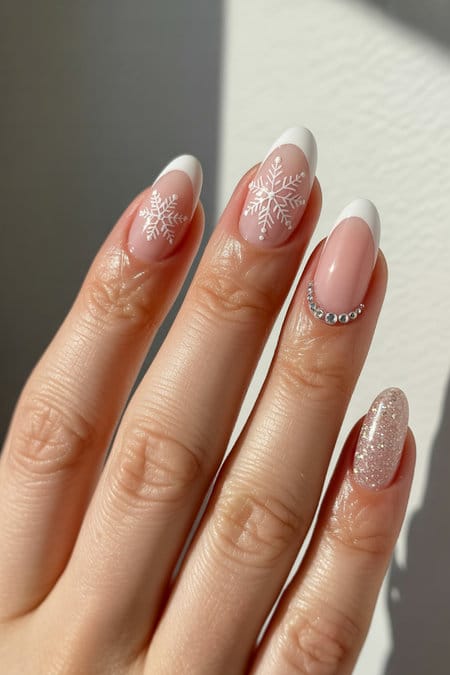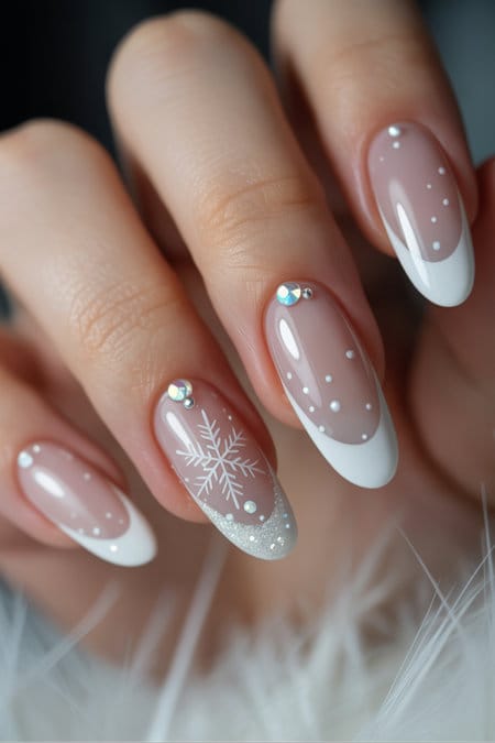 French tips but with snow, then add a few rhinestones to really take things to new level. The rhinestones sparkle and make your nails feel special! I love how they catch light.