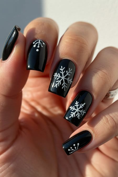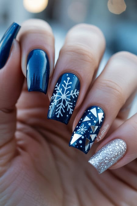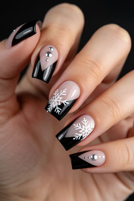 Black geometric shapes at the tips like triangles with white snowflakes mixed in and also some silver dot ornaments. Its artsy and different from normal snowflake nails! Good if you want something unique looking, black definitely stands out in winter.