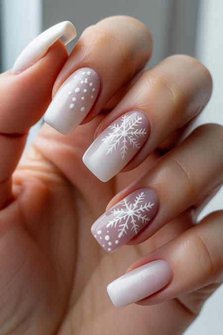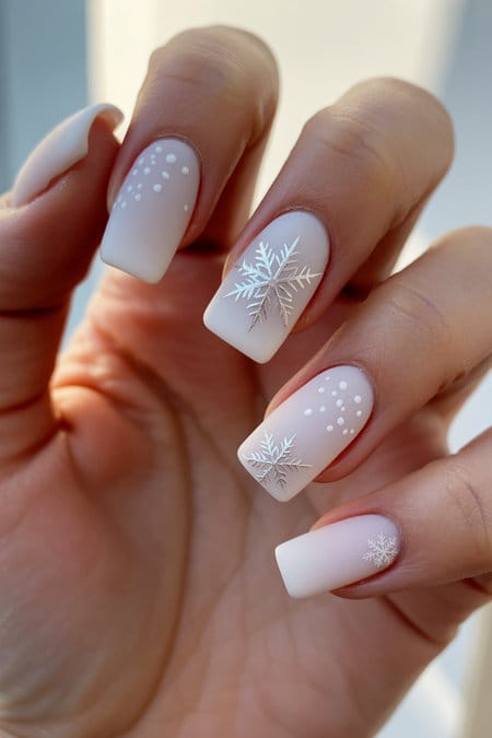 You just put tons of tiny white dots on light color nails in different sizes and then a few medium sized snowflake designs. It looks like snow falling which is simple but really cool! Works good on milky white or blush bases.