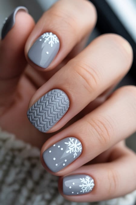 It wouldn’t be winter without some sweater nails when you make that knit pattern on your nails with the help of some clear acrylic powder. Add white snowflakes and the short gray nails suddenly look so cozy! The texture is 3D which is cool and not that hard to learn.