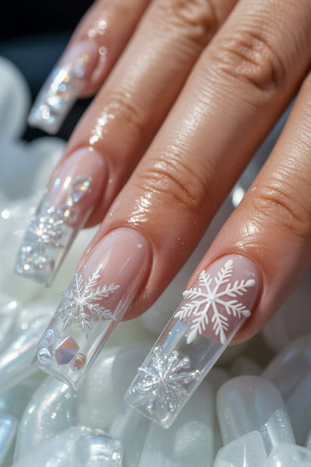 Clear acrylic nails with white or holo icy effect snowflakes look soooo stunning here. The see through part with frosty snowflakes is really pretty and different! Its literally like frosted glass nails.