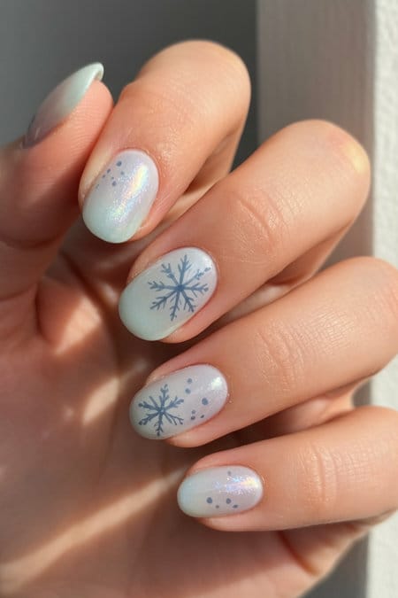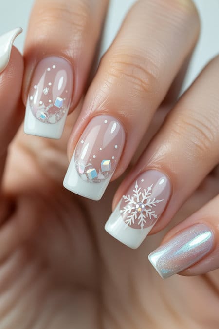 French tips but the white parts have holographic crystal shapes stuck on to look like icy details. Use detail brush and white polish to add some snowflakes and add a gemstone in the center! Its subtle but people notice the beauty up close.