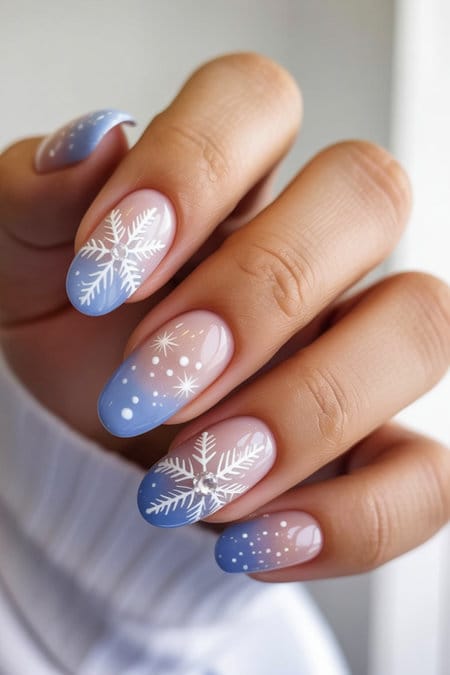 Neutral base that fade to baby blue, it looks like the sky in winter. Then you add the white snowflakes with some rhinestone centers. Makes me think of frozen princess stuff.