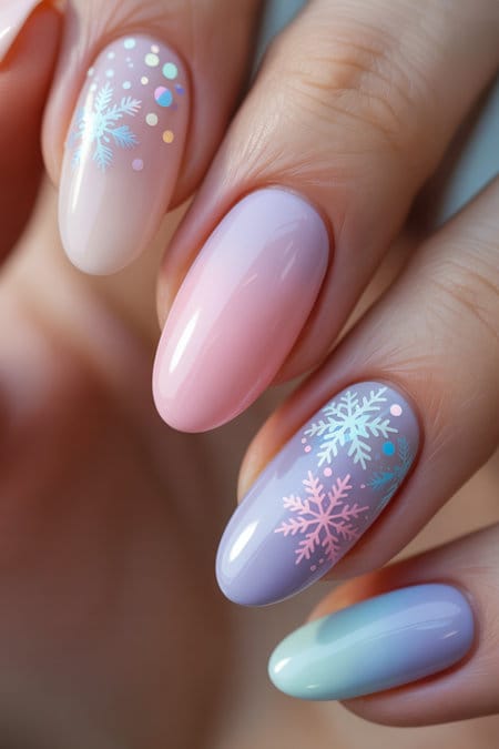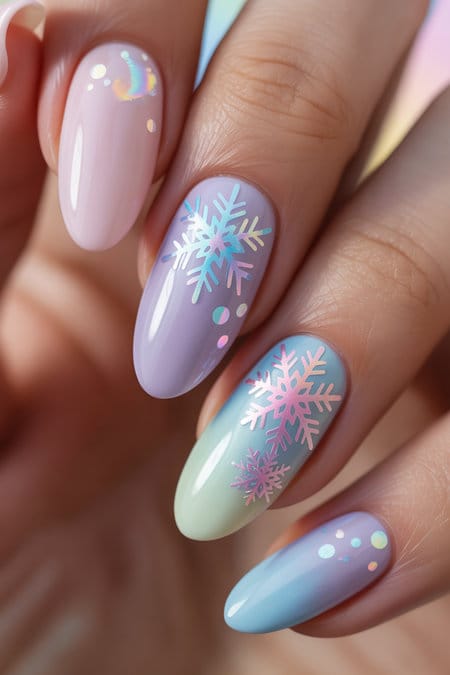 Multiple pastel colors fading together like pink purple and blue with white snowflakes. The soft rainbow with snowflakes is dreamy! This ones good if you cant pick one color.