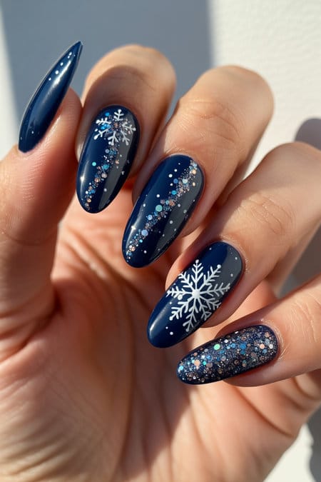 Navy blue is so pretty for winter and nobody does it enough. I put glitter going across some nails diagonal, almost like a frozen trail, and then add some large accent white snowflakes! The dark blue with bright white just looks really good together.