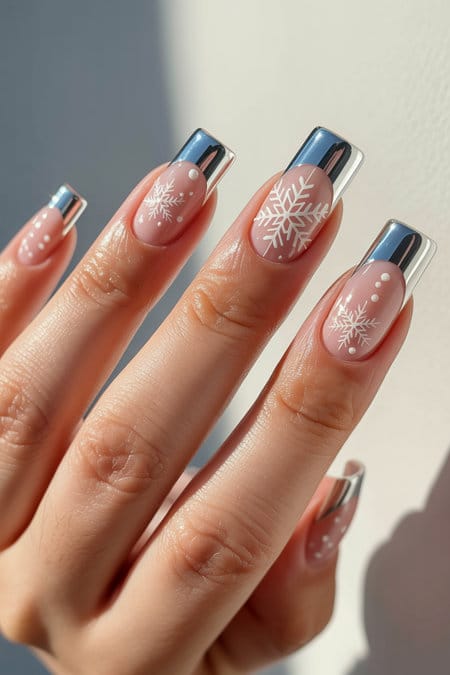 Chrome is really popular right now. I use neutral base and put silver chrome on the tips that looks super shiny. Add snowflakes on a few nails and its modern winter nails!