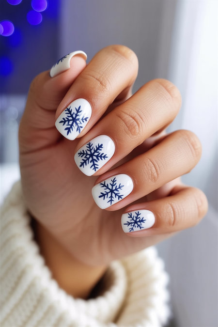 The snowflakes on these are bigger than usual which looks really cool. Snow white base keeps everything clean and simple while the large blue snowflakes becomes the main focus of each nail.