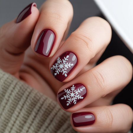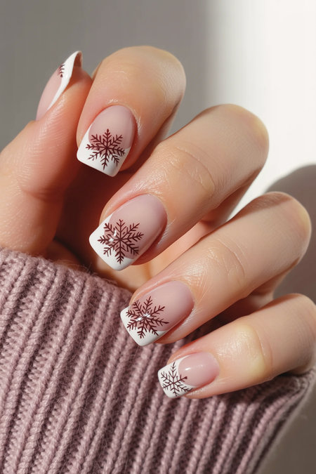 Here we have French tips but I made them festive with burgundy. The high contrast snowflakes pops against the neutral base really nicely. This is my favorite classy look with a modern twist.