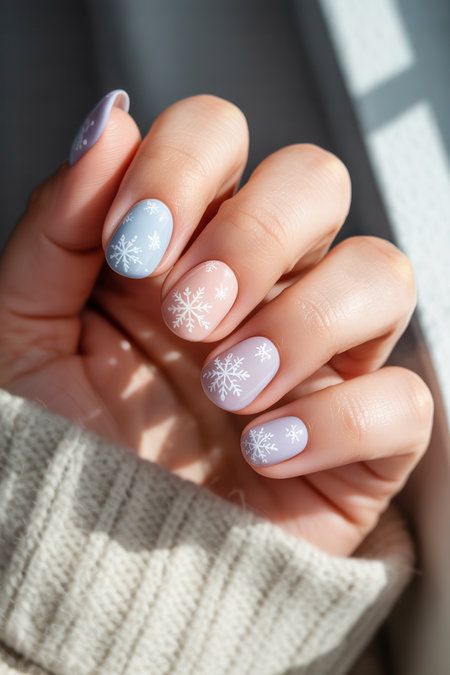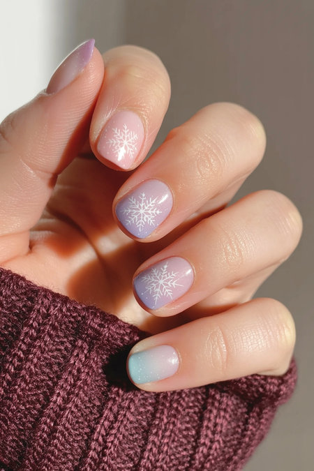 The colors go from soft pastel pink to purple, then to blue in ombre style – so soft and cute. White snowflakes on top makes it even prettier. It’s a very serene and cute winter nails look.