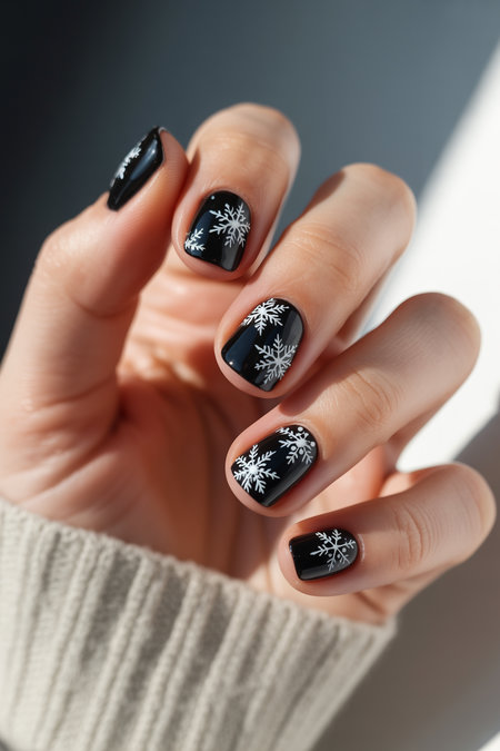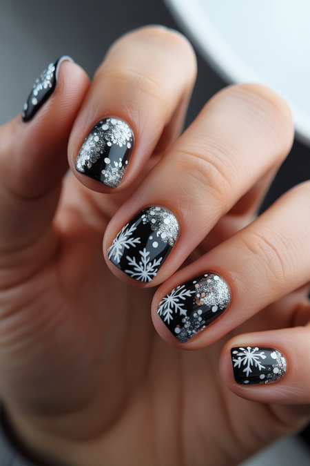 If you like a modern nail design – black nails always looks cool and edgy. Adding silver glitter with the white snowflakes keeps it winter themed.