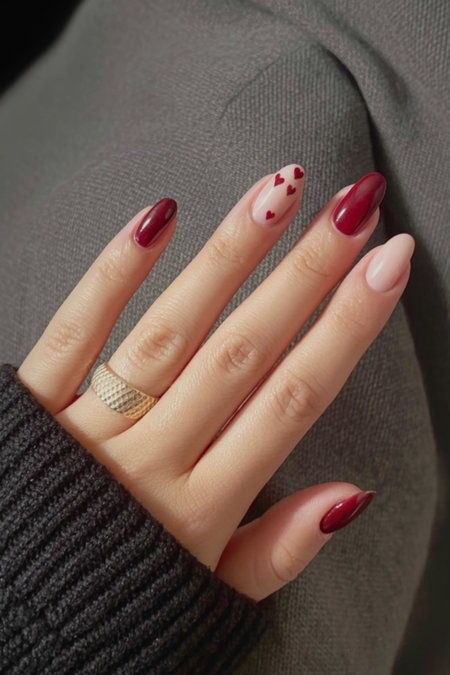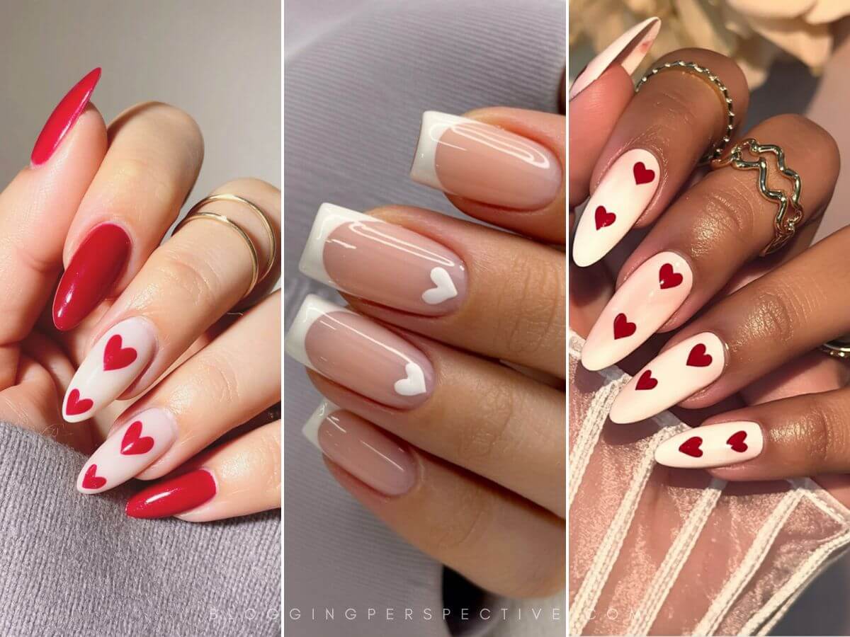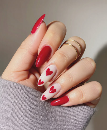 I mix cherry red with beige or nude colors. Some nails are red and some are neutral! Hearts go on different ones. Looks put together but each nail is a little different.