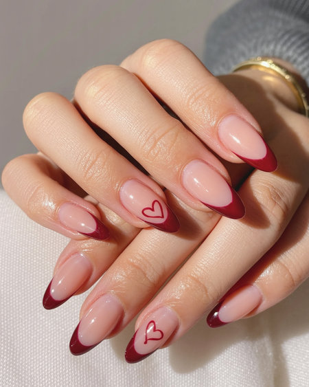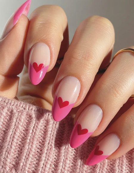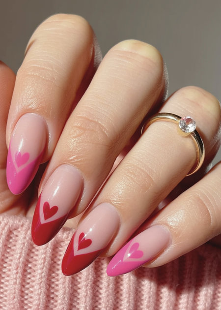 Pointed French mani are so dramatic. I love how they look! Red and pink tips with hearts make it bold and pretty. The almond shape makes everything look cooler because of how the nail points toward the tip.