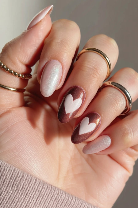 Brown nails are having a moment, when it comes to heart nails. Add some shimmer to brown and put hearts on top! It looks natural but still pretty and feminine. The shimmer catches light in a really nice way.