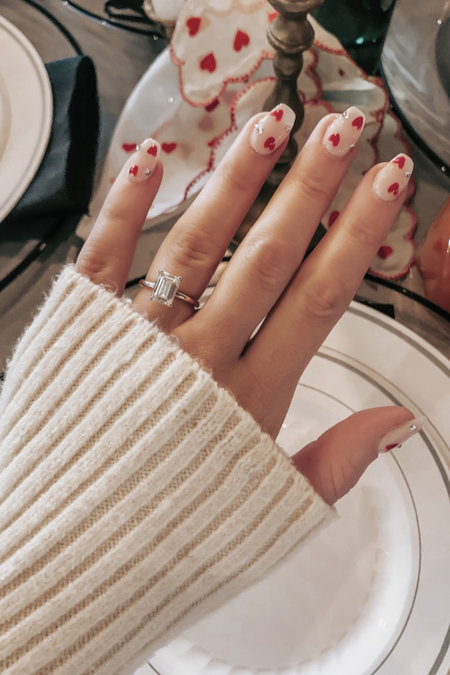 Want some bling? Add rhinestones to your heart nails. Red hearts with tiny rhinestones around them or in the middle look so good! Just use good top coat or they fall off which is annoying.