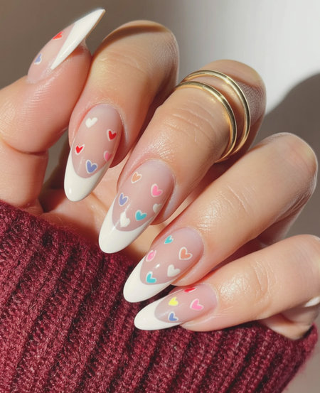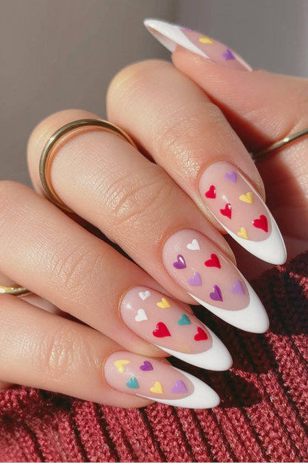 Long French nails have so much room for art. Tiny hearts in all different colors scattered everywhere! Like confetti on your nails. Pink red purple orange whatever colors you want, everyone always says they like these.