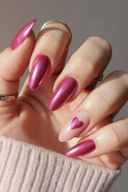 Chrome nails are so popular now. Pink chrome is the best one! Add hearts on top in a different color or draw them with nail art. The shiny metallic finish is really pretty when light hits it.