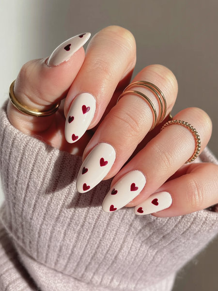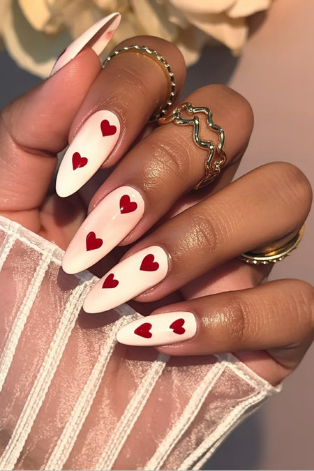 White nails with red hearts scattered on them. Long almond shape looks really elegant! The red really stands out against the white.
