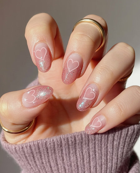 Blush glitter is so feminine and pretty. Pastel pink heart outlines on top! The glitter sparkles and the hearts keep it from being too plain. This is one of my favorites when I want something girly.