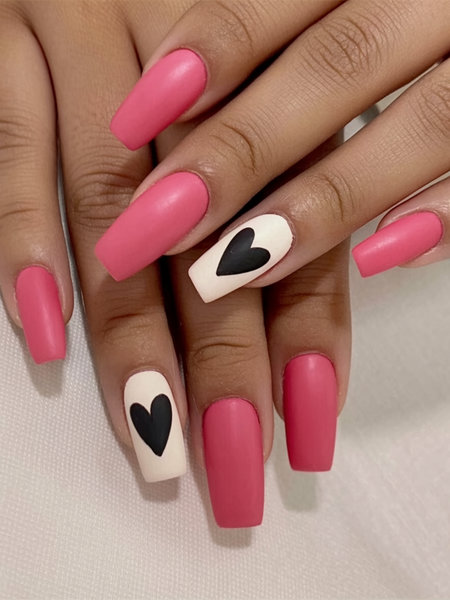 Matte nails are so different from shiny ones. Hot pink matte is bold! One white nail with a black heart makes a cool focus point. Matte finish looks more expensive looking, but you can totally go glossy too.