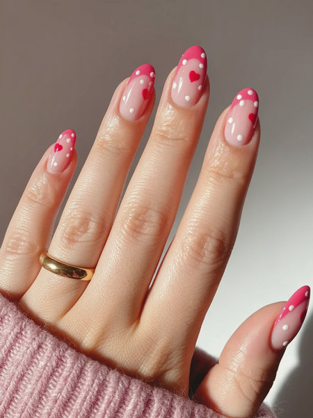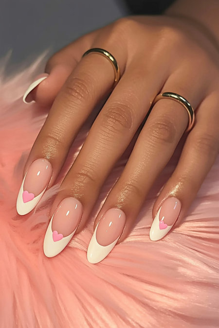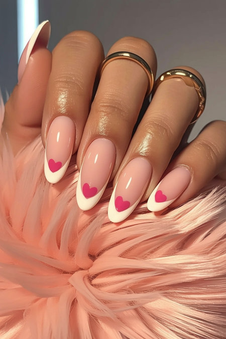 Really thin French tips look delicate. Then bright pink hearts which are bold! The contrast is cool because the tip is so subtle. More people should try this combo.