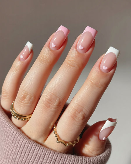 White French tips with tiny pink hearts. So simple! But really pretty and you can wear it to work. The hearts are light pink and sit right at the tip of the nail, goes with everything in your closet.