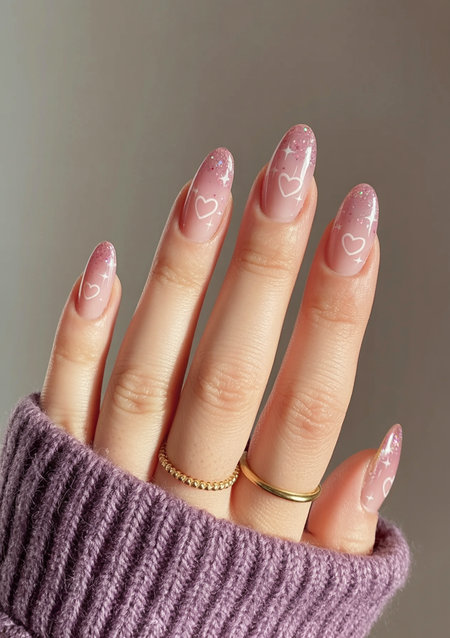 This design is so sparkly. You do pink glitter on the tips that fades out. White hearts and stars go on top! Super pretty for parties or when you just want your nails to look magical and special.