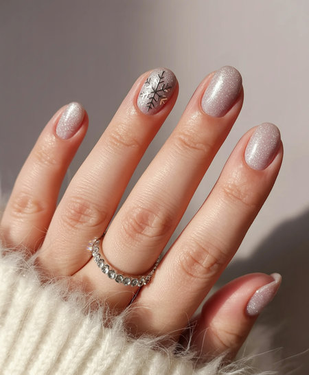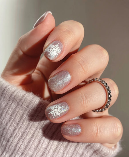Short nails can be just as cute. White glitter is sparkly and fun on the base! Adding chrome snowflake makes it special. The chrome really stands out against the glitter, which is super cool looking.